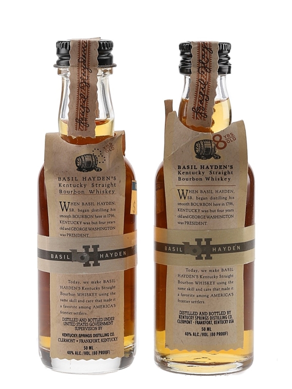 This lot contains two miniature bottles of Basil Hayden's 8 Year Old Kentucky Straight Bourbon Whiskey, distilled and bottled by Kentucky Springs Distilling Co.