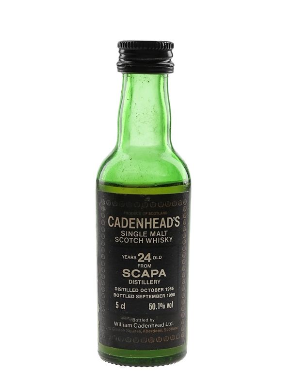 A miniature bottle of Scapa 24 Year Old Single Malt Scotch Whisky. This was distilled in October 1965, matured for 24 years and bottled at a cask strength of 50.1% ABV in September 1990 by Cadenhead's.