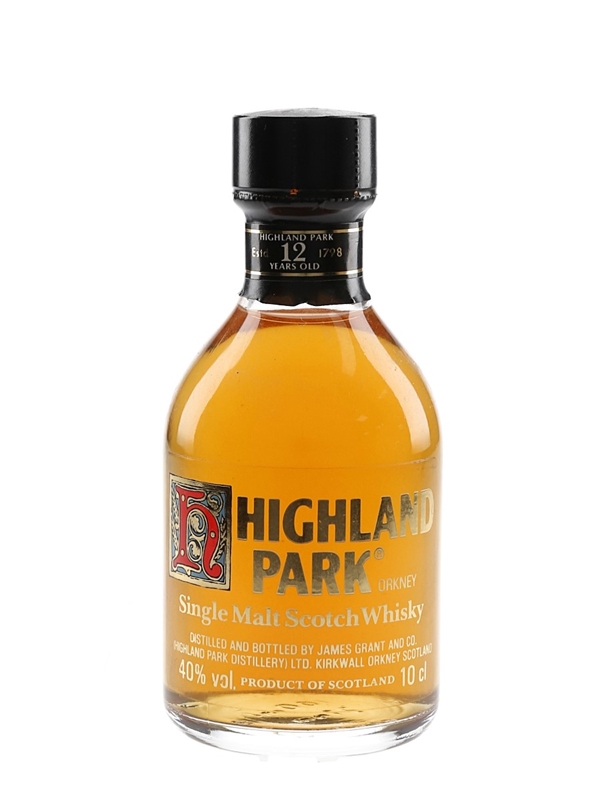 A 10cl miniature bottle of Highland Park 12 Year Old Orkney Single Malt Scotch Whisky produced by James Grant And Co. We estimate this was bottled in the 1980s.