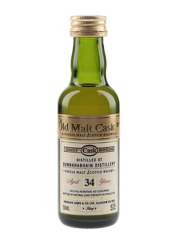 A miniature bottle of Bunnahabhain 34 Year Old Single Malt Scotch Whisky, bottled by Douglas Laing for the Old Malt Cask series.