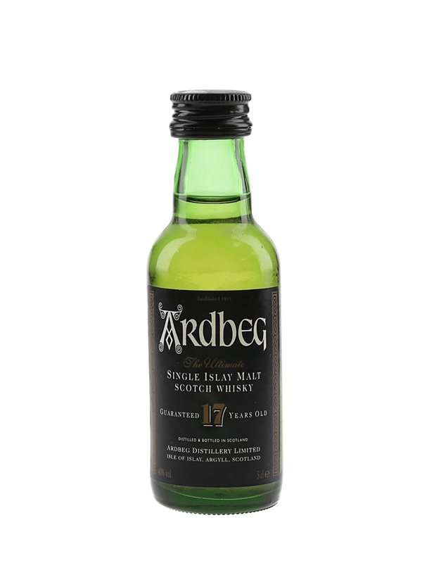 A miniature bottle of the Ardbeg 17 Year Old The Ultimate Islay Single Malt Scotch Whisky.