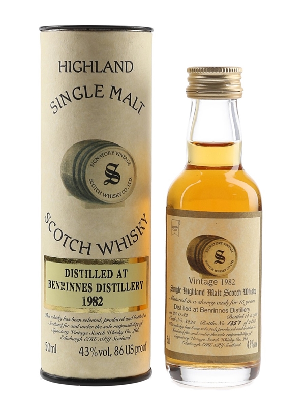 A miniature bottle of Benrinnes 15 Year Old Single Highland Malt Scotch Whisky. This was distilled on 25 November 1982, matured in a single sherry cask and bottled on 14 October 1998 by Signatory Vintage.