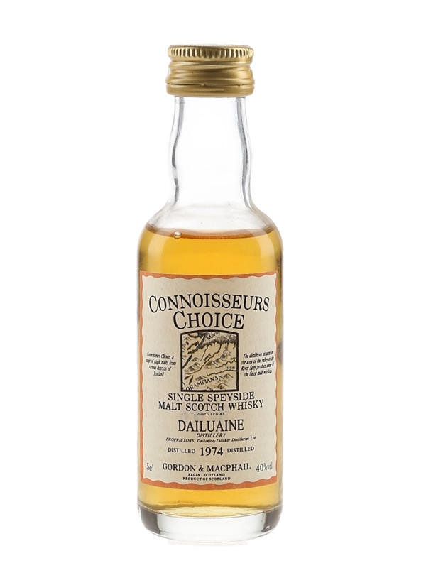 A miniature bottle of Dailuaine 1974 Single Speyside Malt Scotch Whisky bottled by Gordon & MacPhail as part of the Connoisseurs Choice series. The bottling code indicates this was bottled in 1995.