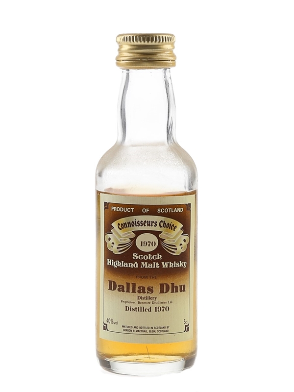 A miniature bottle of Dallas Dhu Highland Malt Scotch whisky distilled in 1970 and bottled by Gordon & MacPhail as part of their Connoisseurs Choice series. We estimate this was bottled in the 1980s.