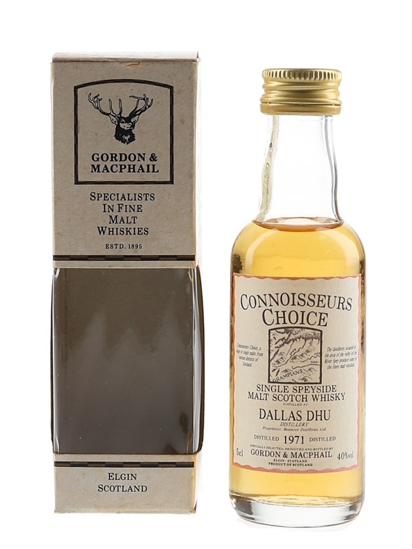 A miniature bottle of Dallas Dhu 1971 Single Speyside Malt Scotch Whisky bottled by Gordon & MacPhail as part of the Connoisseurs Choice series. The bottling code indicates this was bottled in 1996.
