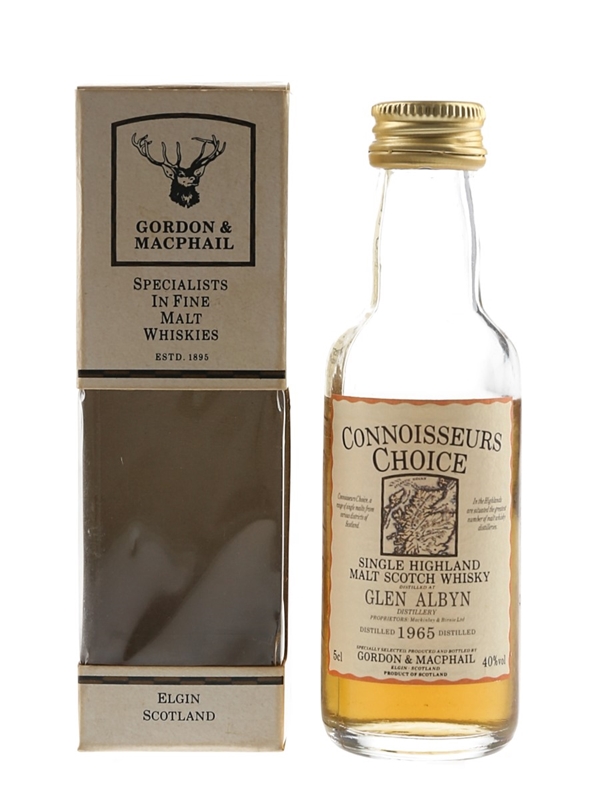 A miniature bottle of Glen Albyn 1965 Single Highland Malt Scotch Whisky. This was bottled by Gordon & MacPhail as part of the Connoisseurs Choice series, we estimate in the 1990s.
