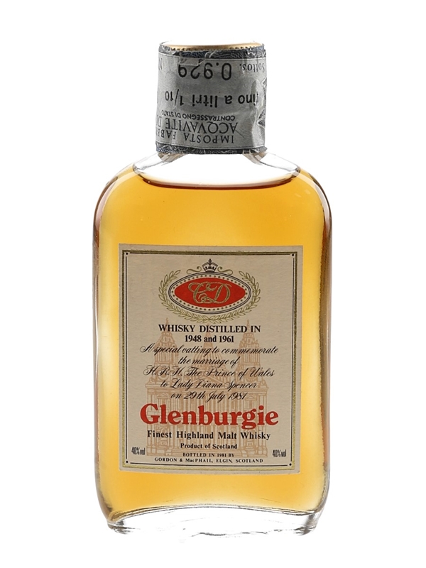 A miniature of Glenburgie Finest Highland Malt Whisky bottled in 1981 by Gordon and MacPhail to commemorate the marriage of Charles and Diana. This is a vatting of whisky distilled in 1948 and 1961, the respective birth years of Charles and Diana. This was imported to the Italian market.