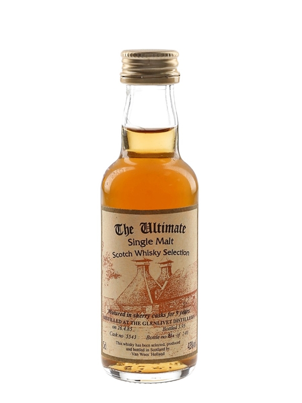 A miniature bottle of Glenlivet 9 Year Old Single Malt Scotch Whisky. This was distilled on 26 April 1985 matured in sherry casks and bottled in March 1995 for Van Wees' The Ultimate Single Malt Scotch Whisky Selection.