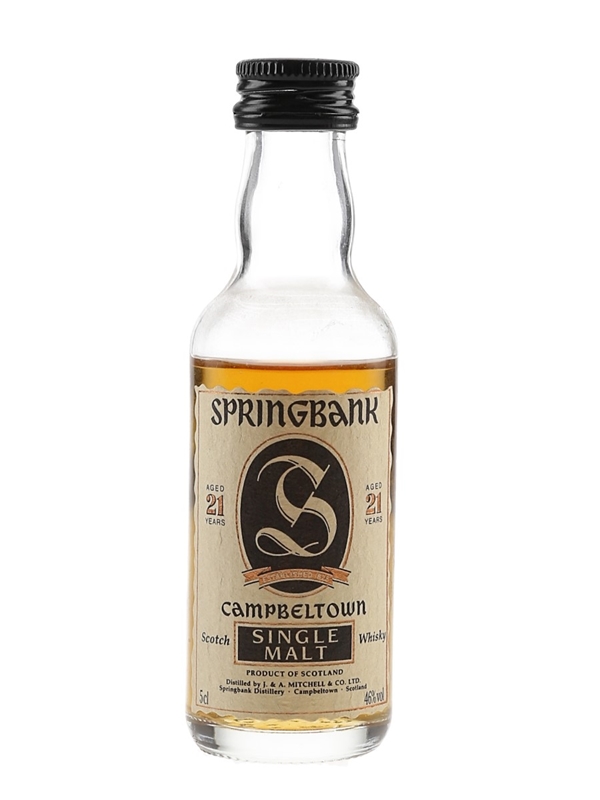 A miniature bottle of Springbank 21 Year Old Campbeltown Single Malt Scotch Whisky. The bottling code indicates this was bottled in 1993.