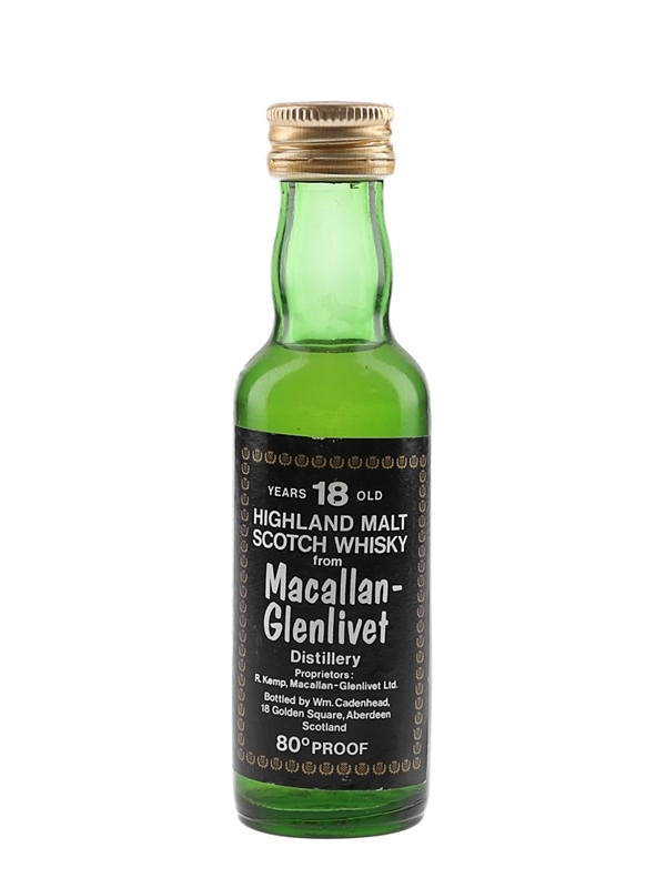 A miniature bottle of Macallan-Glenlivet 18 Year Old Highland Malt Scotch Whisky. This was bottled by Cadenhead's, we estimate in the 1970s.