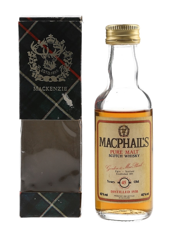 A miniature bottle of MacPhail's 45 Year Old Pure Malt Scotch Whisky. This was distilled in 1938 and bottled by Gordon & MacPhail.
