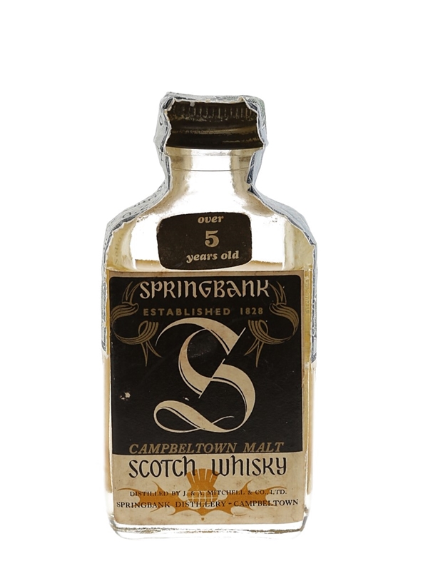 A miniature bottle of Springbank 5 Year Old Campbeltown Malt Scotch whisky. This was imported to Italy by Consorzio Vinicolo A Sutti, we estimate in the 1970s.