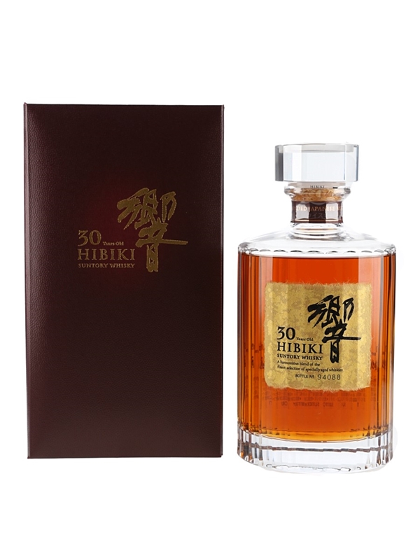 A bottle of Hibiki 30 Year Old Suntory Whisky produced in Japan. This is a critically acclaimed blend from Suntory and is presented in a Kagami crystal decanter. It is presented in a 30-faceted crystal celebrating the beauty and elegance that is Hibiki.
