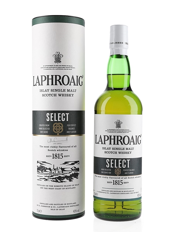 A bottle of Laphroaig Select Single Malt Scotch Whisky, aged in a combination of Oloroso sherry butts, American white oak hogsheads seasoned with Pedro Ximenez, quarter casks and first fill bourbon casks.