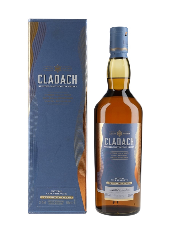 A bottle of Cladach Blended Malt Scotch Whisky. This is a blend of single malts from coastal distilleries: Inchgower, Clynelish, Talisker, Oban, Caol Ila and Lagavulin. It was bottled at natural cask strength in 2018 for Diageo's Special Releases series.