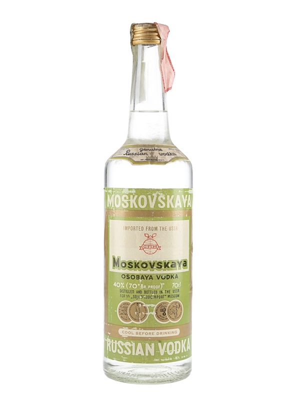 A bottle of Moskovskaya Genuine Russian Vodka imported from the USSR. This was imported to the Italian market by Averna SPA, we estimate in the 1990s.