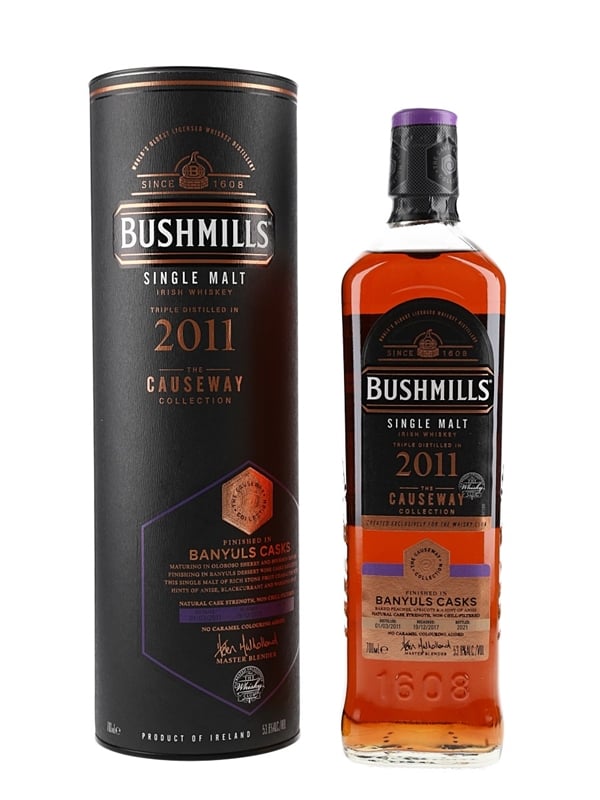 A bottle of Bushmills 2011 Single Malt Irish Whisky. This was distilled in 2011, finished in Banyuls casks and bottled in 2021 for The Causeway Collection.