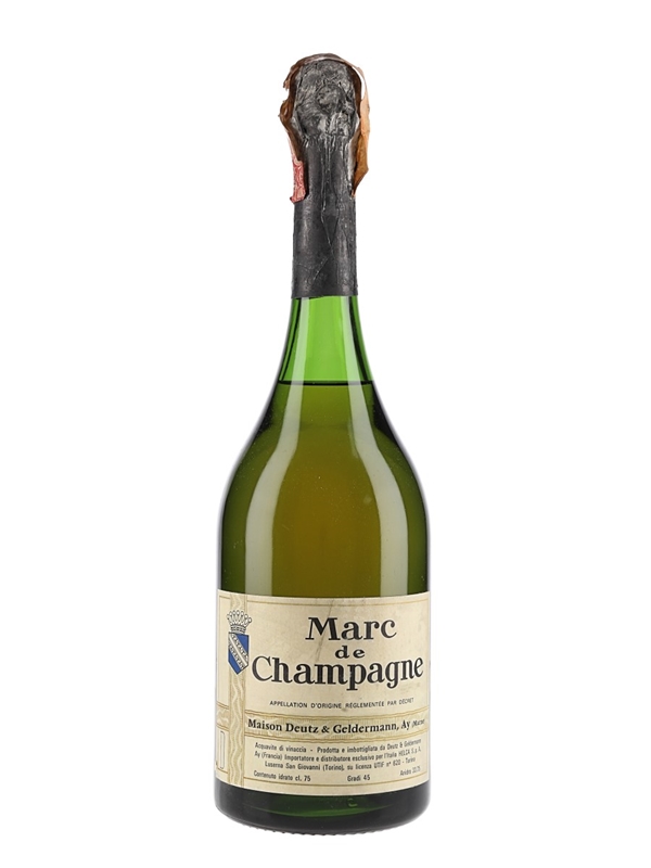 A bottle of Marc De Champagne produced in France by Maison Deutz & Geldermann. This was imported to the Italian market by Ghirlanda, we estimate in the 1980s.