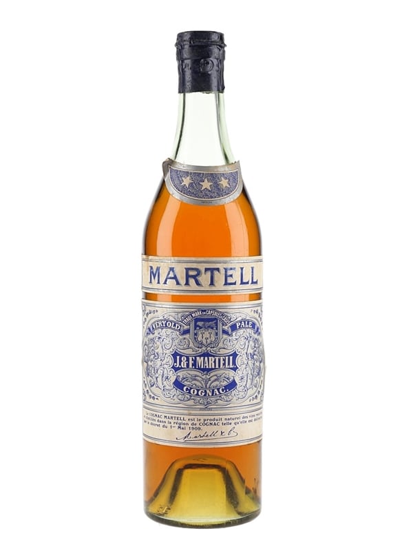 A bottle of Martell 3 Star Very Old Pale Cognac, sealed with a spring cap closure. We estimate this was bottled in the early 1950s.