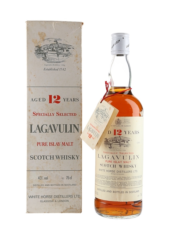 A bottle of Lagavulin 12 Year Old Specially Selected Pure Islay Malt Scotch Whisky, bottled by White Horse Distillers. We estimate this was bottled in the early 1980s.