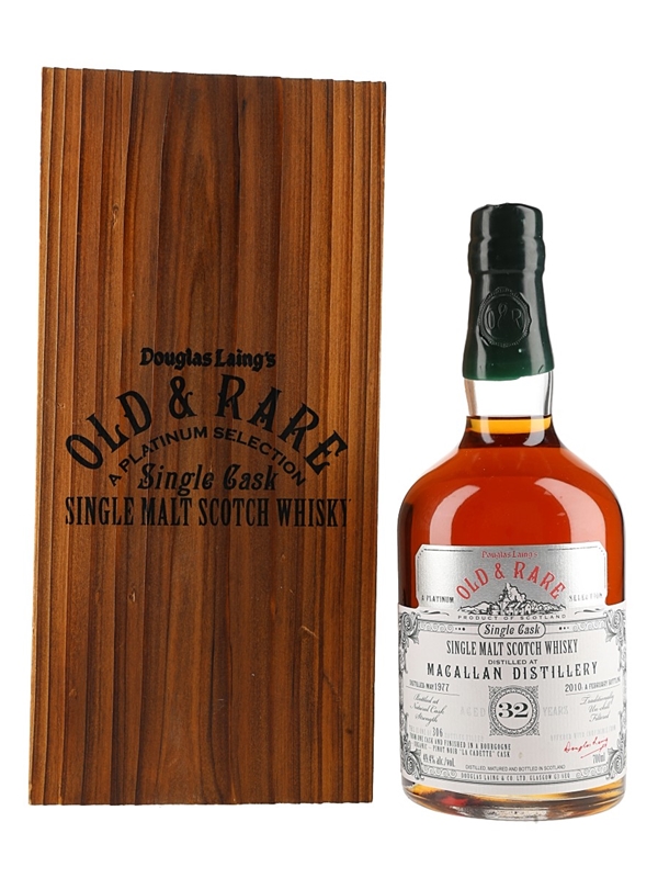 A bottle of Macallan 32 Year Old Single Malt Scotch Whisky. This was distilled in 1977 matured in a single cask and bottled in 2010 for Douglas Laing's Old & Rare Platinum Selection series.