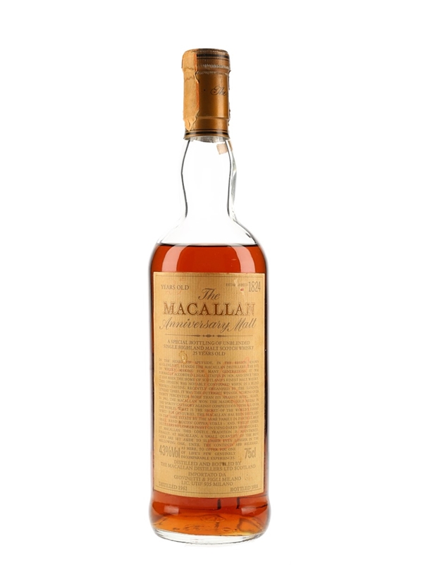 A bottle of The Macallan 1962 Single Highland Malt Scotch Whisky. This was matured in sherry casks for 25 years and bottled in 1988 as part of the Anniversary Malt series. This was imported to the Italian market by Giovinetti & Figli.
