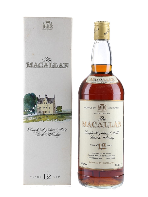 A litre bottle of The Macallan 12 Year Old Single Malt Scotch Whisky, matured in sherry wood. We estimate this was bottled in the 1980s.