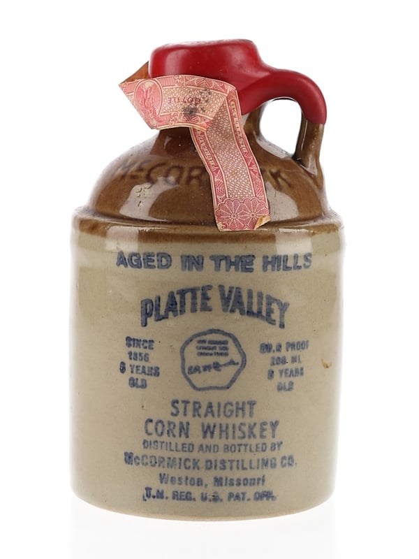 A 20cl ceramic bottle of Platte Valley 5 Year Old Corn Whiskey from the McCormick Distilling Co., Missouri. We estimate this was bottled in the 1970s.