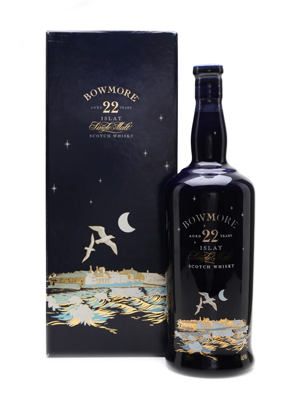 A bottle of Bowmore 22 Year Old, presented in a blue ceramic bottle. We estimate this was bottled in the mid 1990s.