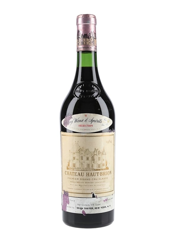 A bottle of 1964 Château Haut-Brion Premier Grand Cru Classé from the Pessac-Léognan appellation in Bordeaux. This was imported to the US marker, by DeanThayer.