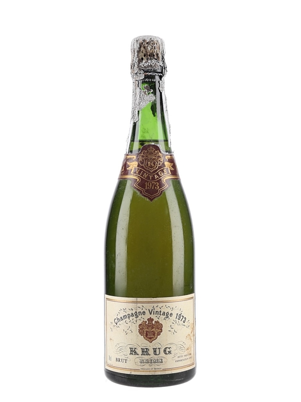 A bottle of Krug 1973 vintage Champagne, a blend of 51% Pinot Noir, 16% Pinot Meunier and 33% Chardonnay.