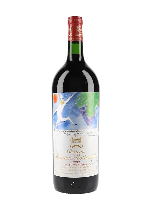 A magnum bottle of Chateau Mouton Rothschild 1982 from Bordeaux's Pauillac appellation, featuring a label by John Huston (1906-1987). This was released to celebrate Baron Philippe's 60th harvest.