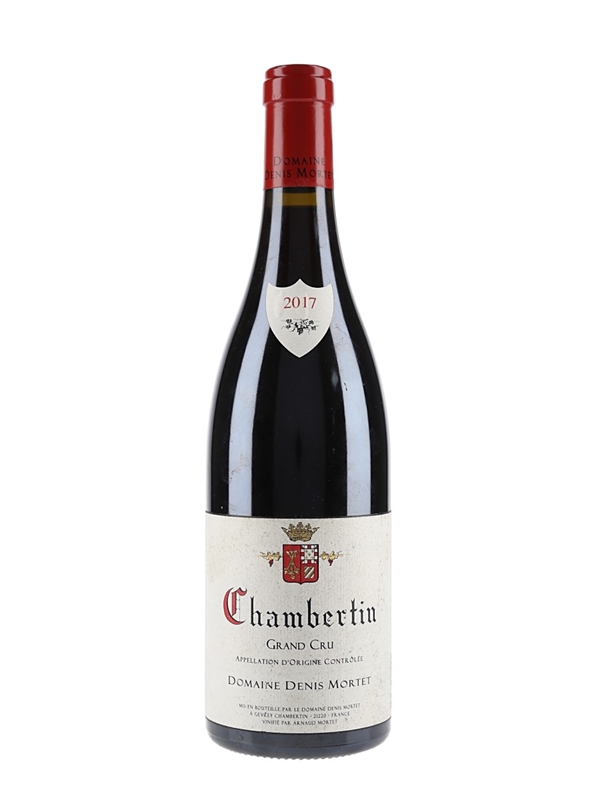 A bottle of 2017 Chambertin Grand Cru from Burgundy, vinified by Arnaud Mortet and bottled by Domaine Denis Mortet.
