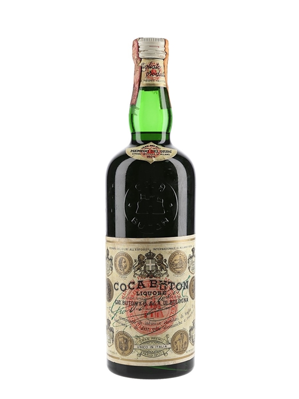 A bottle of Coca Buton, an Italian liqueur made from alcohol infused with coca leaves and other aromatic herbs. We estimate this was bottled in the 1970s.