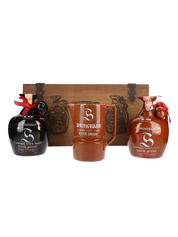 This lot contains two 75cl bottles of Springbank 10 and 12 Year Old Campbeltown Malt Scotch Whisky, presented in black and brown ceramic jugs with stoppers and a branded water jug, presented in a wooden box.