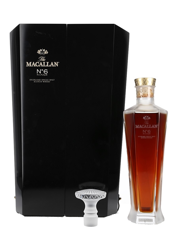 A bottle of The Macallan No. 6 in Lalique Decanter Highland Single Malt Scotch Whisky. This was matured for an undisclosed length of time in first fill Jerez de la Frontera Sherry Casks and is presented in a Lalique crystal decanter designed by French Company Lalique, housed in a mirrored presentation case and bottled as part of the 1824 Master Series.