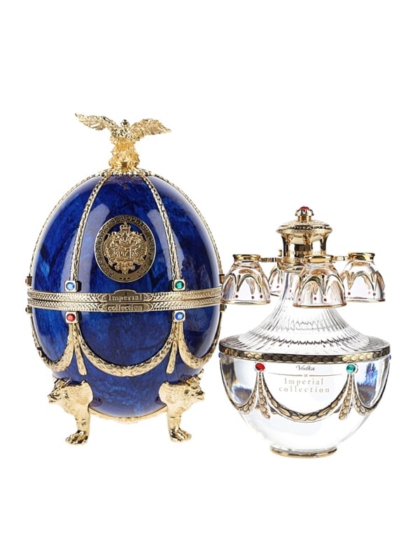 The presentation box contains a malachite green Fabergé style egg, decorated with crystal and gold detail and topped with a gold eagle. Inside the egg is a decanter containing super premium vodka, distilled from wheat and rye with water from Lake Ladoga, and four small glasses with gold and enamel decoration.