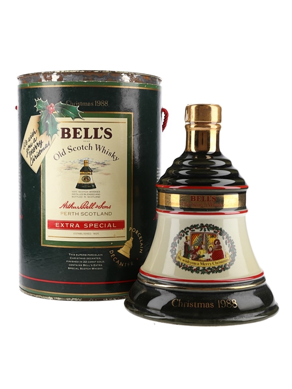 A ceramic decanter of Bell's Extra Special Old Scotch Whisky released for Christmas 1988. The label depicts a choir singing above the words 'We wish you a merry Christmas'.