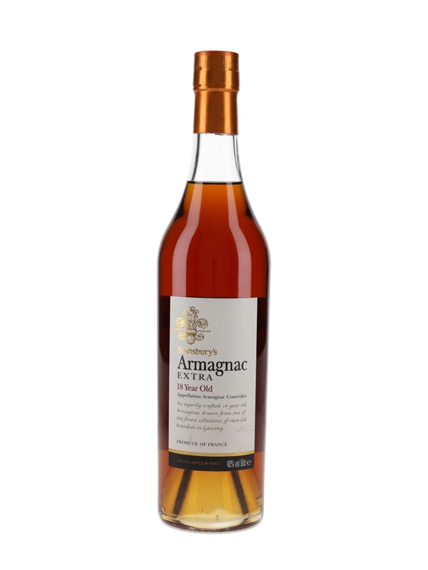 A 50cl bottle of Armagnac Extra 18 Year Old, produced and bottled in France for Sainsbury's Supermarkets Ltd.