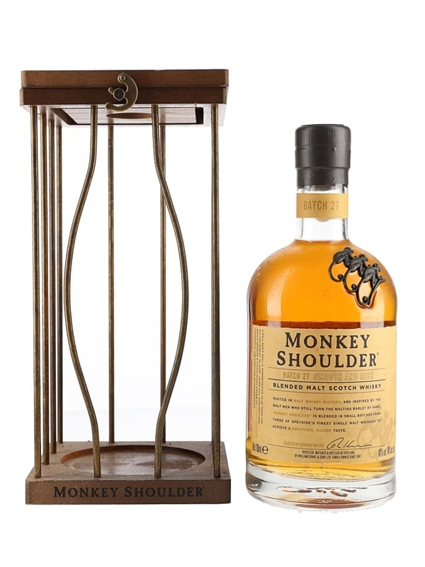 A bottle of Monkey Shoulder Blended Malt Scotch Whisky. This is a blend of malt whiskies from three Speyside distilleries, produced and bottled by William Grant & Sons Ltd. This edition comes in a cage.