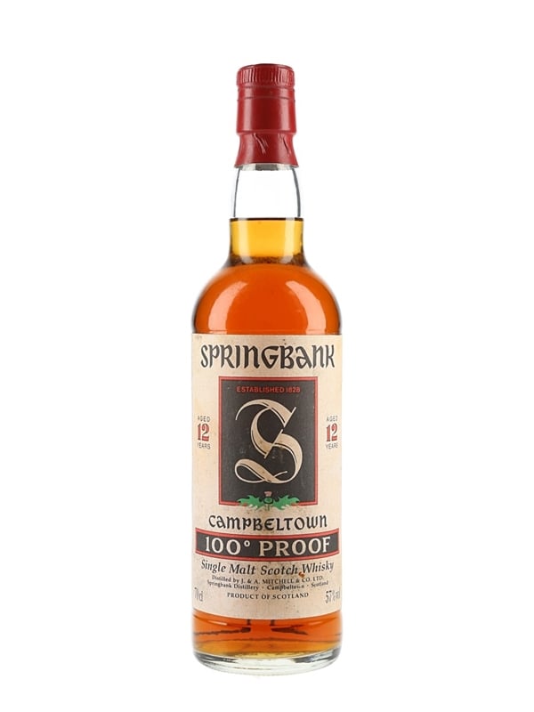 A bottle of Springbank 12 Year Old 100° Proof Campbeltown Single Malt Scotch Whisky. We estimate this was bottled in the 1990s.