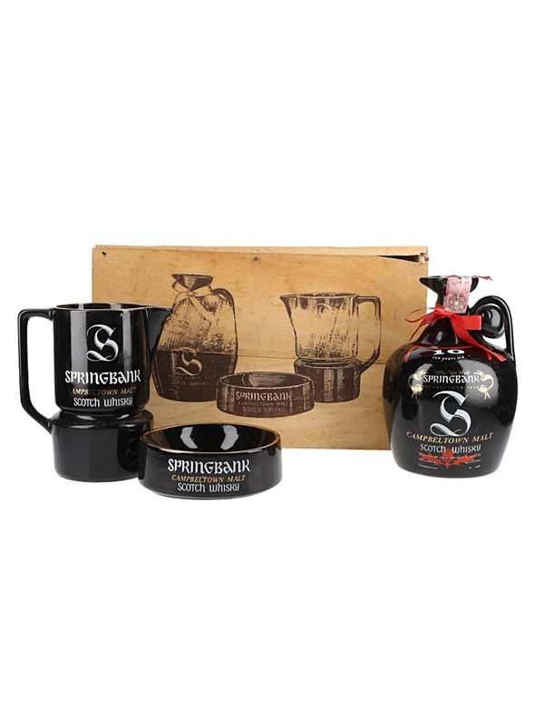 This lot contains a bottle of Springbank 10 Year Old Campbeltown Malt Scotch Whisky, presented in a black ceramic jug with stopper, a branded jug and ashtray, presented in the original wooden box.