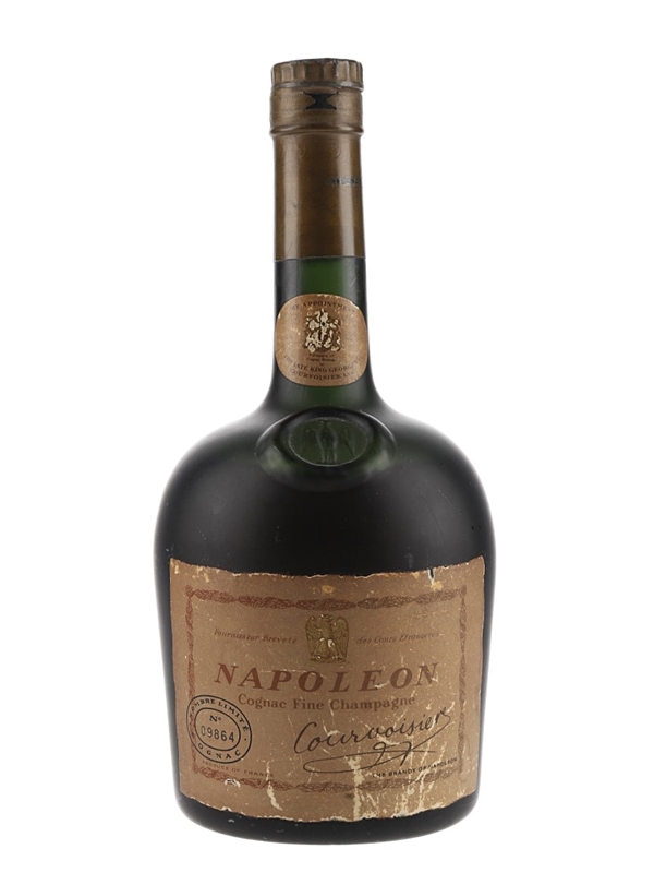 A bottle of Courvoisier Napoleon Old Cognac Fine Champagne. We estimate this was bottled in the 1960s. This is bottle number 09864.