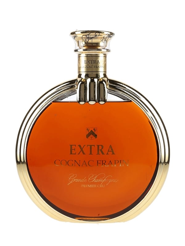 A bottle of Frapin Extra Grande Champagne Cognac, presented in a round decanter.