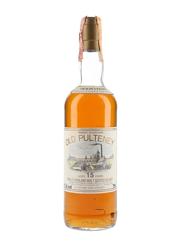 A bottle of Old Pulteney 15 Year Old Single Malt Scotch Whisky. This was distilled on 19 July 1974 and bottled in Scotland for Intertrade Italia S.r.l in August 1989 at natural cask strength.