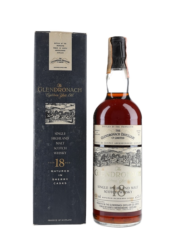 A bottle of The Glendronach 18 Year Old Single Highland Malt Scotch Whisky. This was distilled in 1972, matured in sherry casks before being bottled we estimate in the early 1990s and imported to the Italian market by Previ.