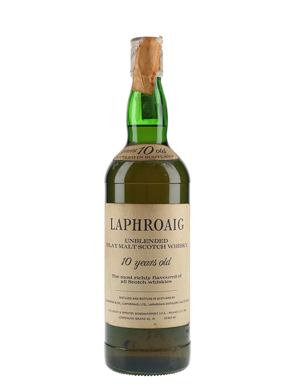 A bottle of Laphroaig 10 Year Old Unblended Islay Malt Scotch Whisky. This was imported into Italy by Bonfantimport, we estimate in the 1980s.
