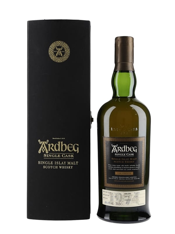 A bottle of Ardbeg 1974 Single Islay Malt Scotch Whisky. This was distilled on 4 October 1974, matured in a single bourbon cask and bottled at 48% ABV on 25 September 2006.