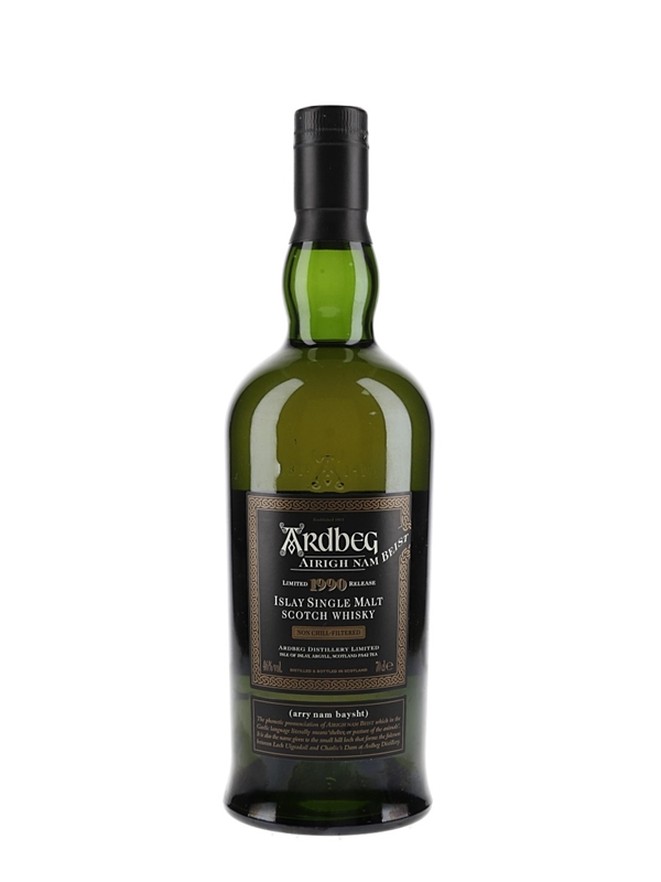 A bottle of Ardbeg Airigh Nam Beist Islay Single Malt Scotch Whisky. This was distilled in 1990 and bottled in 2006.