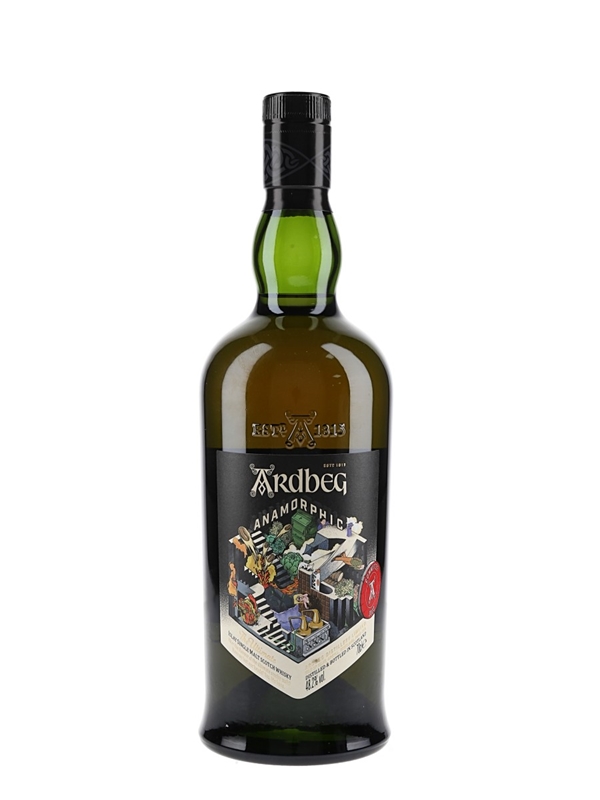 A bottle of Ardbeg Anamorphic The Ultimate Islay Single Malt Scotch Whisky, the Ardbeg Committee Only Edition of 2023. This was matured in heavily scored, toasted and fired casks and bottled at 48.2% ABV.